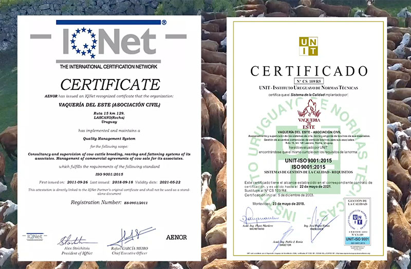 Además, todos los establecimientos que comercializan por Vaquería del Este están certificados de conformidad con el protocolo de carne natural del Instituto Nacional de Carnes del Uruguay que establece requisitos generales de cuidado ambiental, buenas prácticas ganaderas, inocuidad, seguridad y bienestar animal. Un número determinado de establecimientos están certificados como Never Ever 3 (sin uso de antibióticos) así como también se brinda asesoramiento y capacitación a todos los productores para alcanzar la certificación por el Protocolo de Bienestar Animal de INAC.