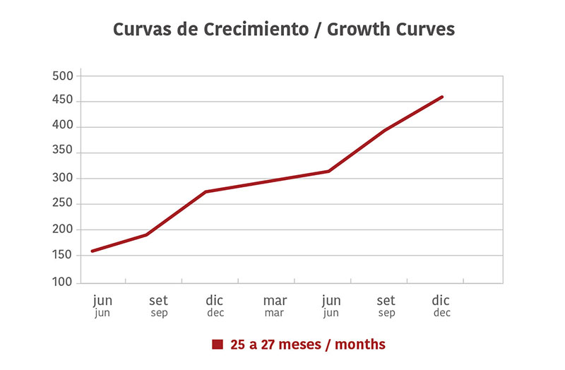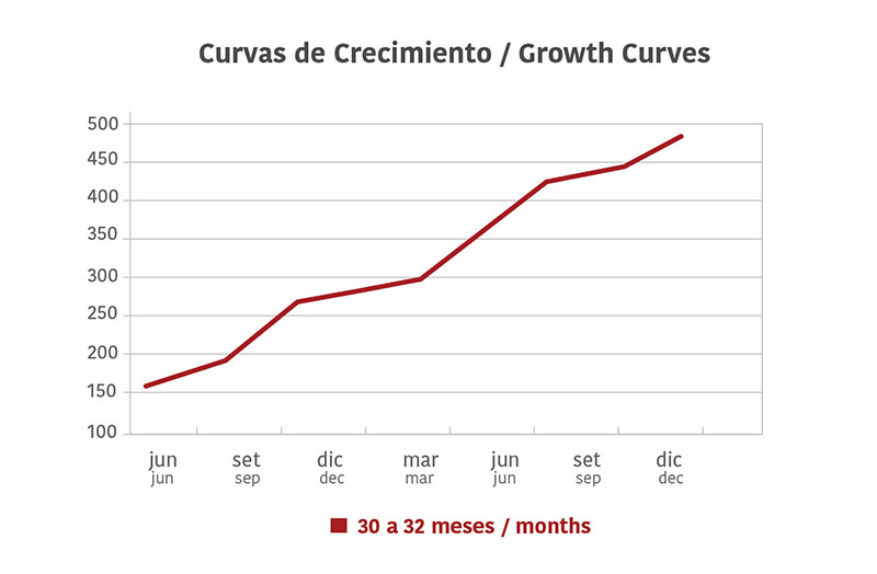 La recría comienza, entre los 6 y 10 meses de edad, con terneros entre 130 y 180 kgs de peso provenientes de los propios rodeos de cría de los establecimientos de ciclo completo o de proveedores seleccionados. Todos lo animales son de razas británicas o sus cruzas. El 90% de los novillos comercializados por Vaquería del Este son jóvenes de hasta 4 dientes. Para lograr los pesos de carcasa requeridos a esas edades, la recría se realiza desde el destete, con niveles de alimentación que permiten grados de ganancia diaria variables pero siempre positivos. Las ganancias diarias promedio para todo el período de recría e invernada oscilan entre los 340 y los 540 gramos, según las curvas de crecimiento definidas para los diferentes tipos de animales. Para lograr esas metas de crecimiento y planificar las ventas, todos los lotes de animales son pesados periódicamente de acuerdo a procedimientos estandarizados. El análisis de dichos registros ha permitido definir las curvas de crecimiento «tipo» para los diferentes novillos.